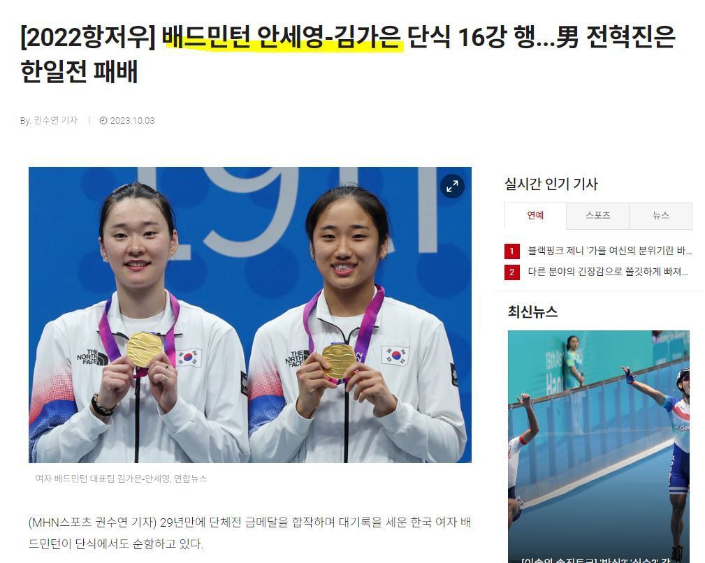 2022 항저우 아시안 배드민턴 여자 안세영(삼성생명), 김가은(삼성생명) 선수가 단식 16강에 진출하였습니다^^