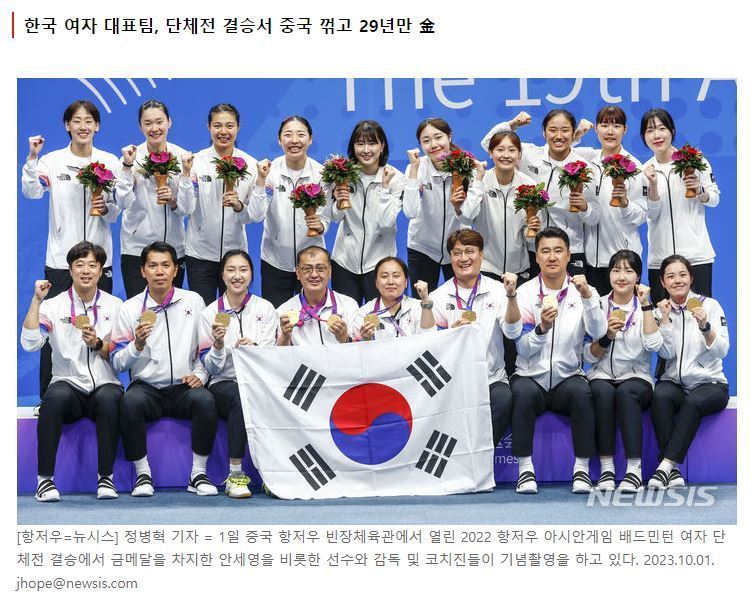 제 19회 2022 항저우 아시안 게임 배드민턴 종목 여자 국가대표팀이 금메달을 획득하였습니다.